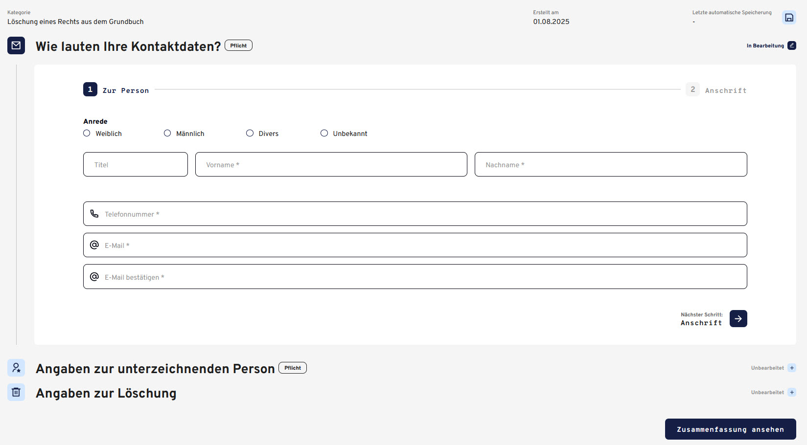Es ist nicht mehr notwendig, handschriftlich ausgefüllte Formulare zu entziffern oder die erforderlichen Daten mit hohem Zeitaufwand und entsprechender Fehleranfälligkeit telefonisch abzufragen. Die Beteiligten wählen einfach das notarielle Verfahren aus, mit dem sie sich an das Notarbüro wenden wollen und geben die für die Urkundenvorbereitung benötigten Daten ein.